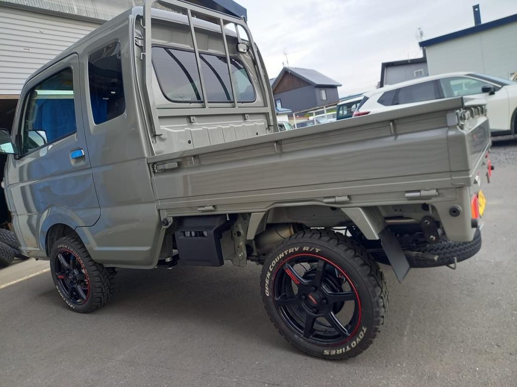 装着 旭川カーメデア伊藤さんより プロデュース販売 フロント車高調整 ショックストロークも アップしてるので 軽トラ 特有のフロントサスの突き上げは 緩和され乗り心地 良く リアブロックも 補正角度付き メンバーダウンもしています。